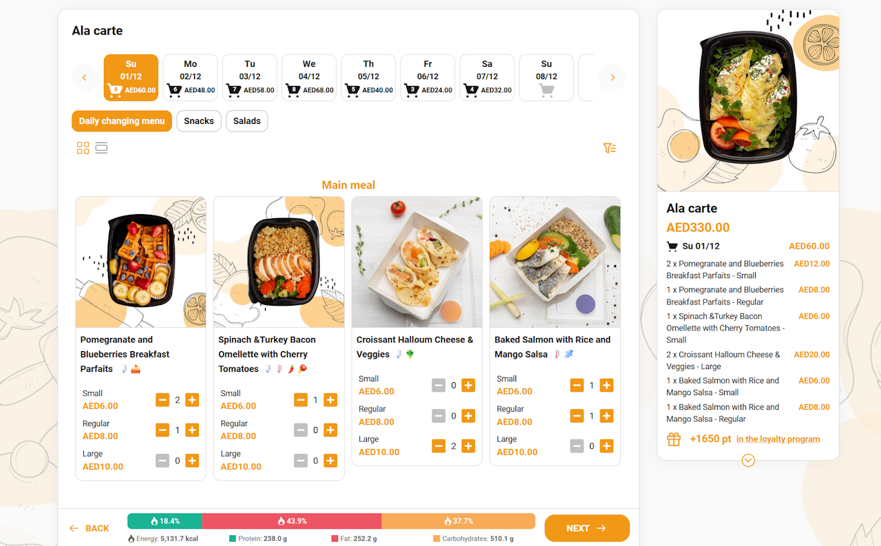 The A la carte meal plan is a modern, flexible approach to ordering meals from a meal prep company. Instead of committing to a fixed weekly meal plan, customers can create their own menu – selecting specific meals for specific days, in exactly the portion sizes they want.