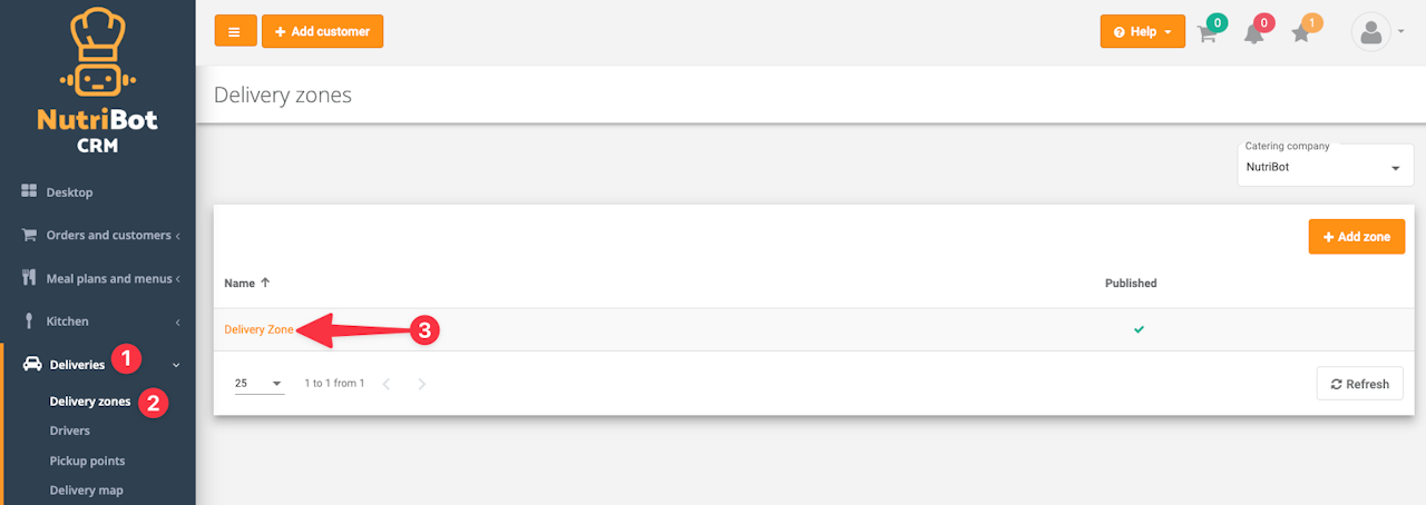 To add delivery hours, go to the Deliveries [1] tab, then Delivery zones [2] and select the created zone [3]