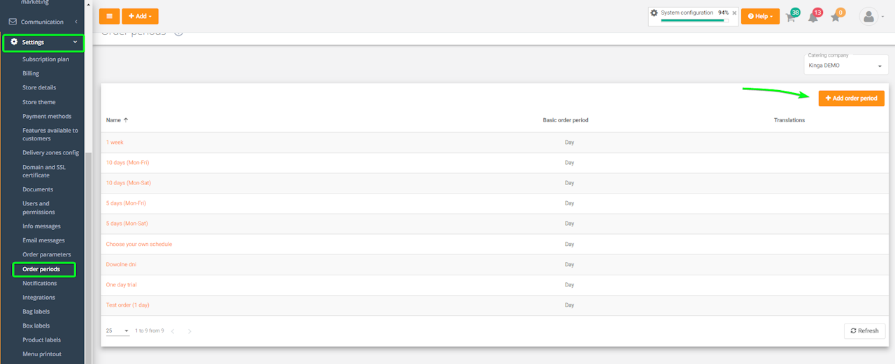 To do this, go to the 'Settings' tab → 'Order periods' and click 'Add order period'.
