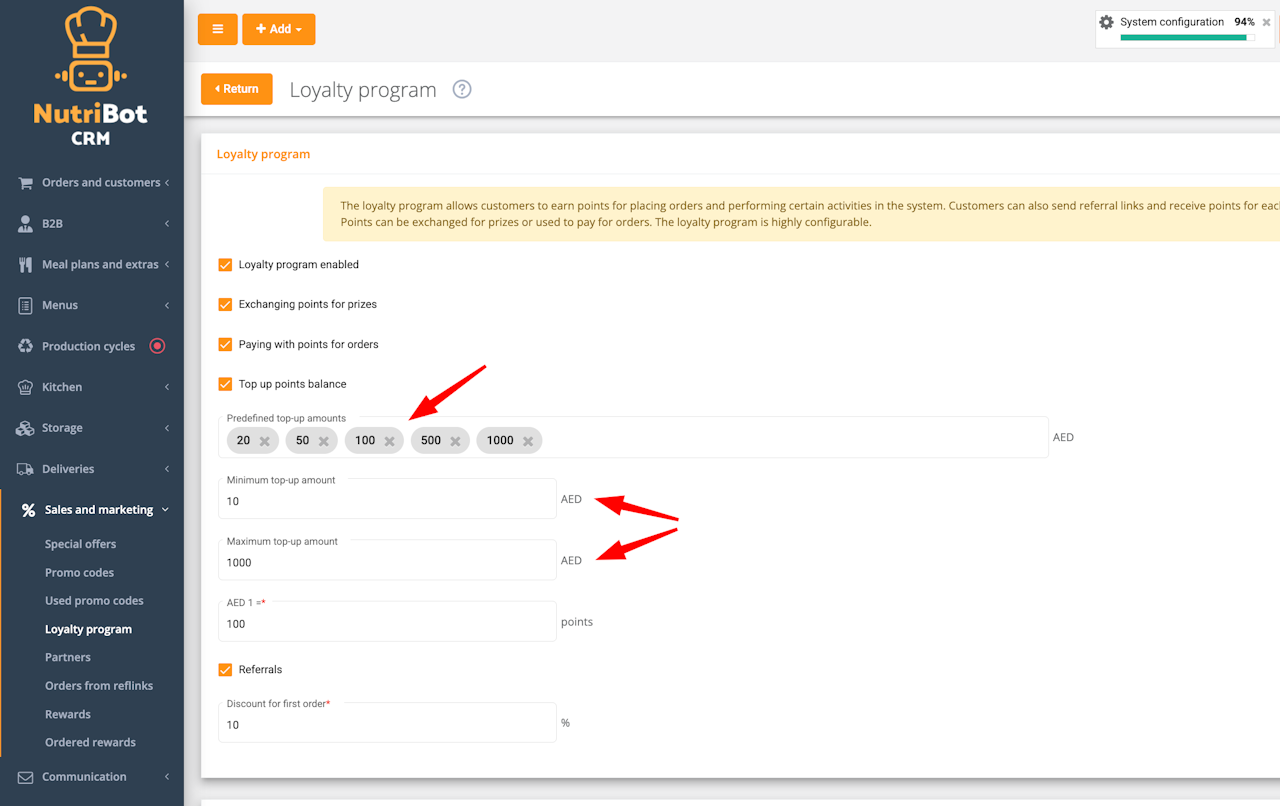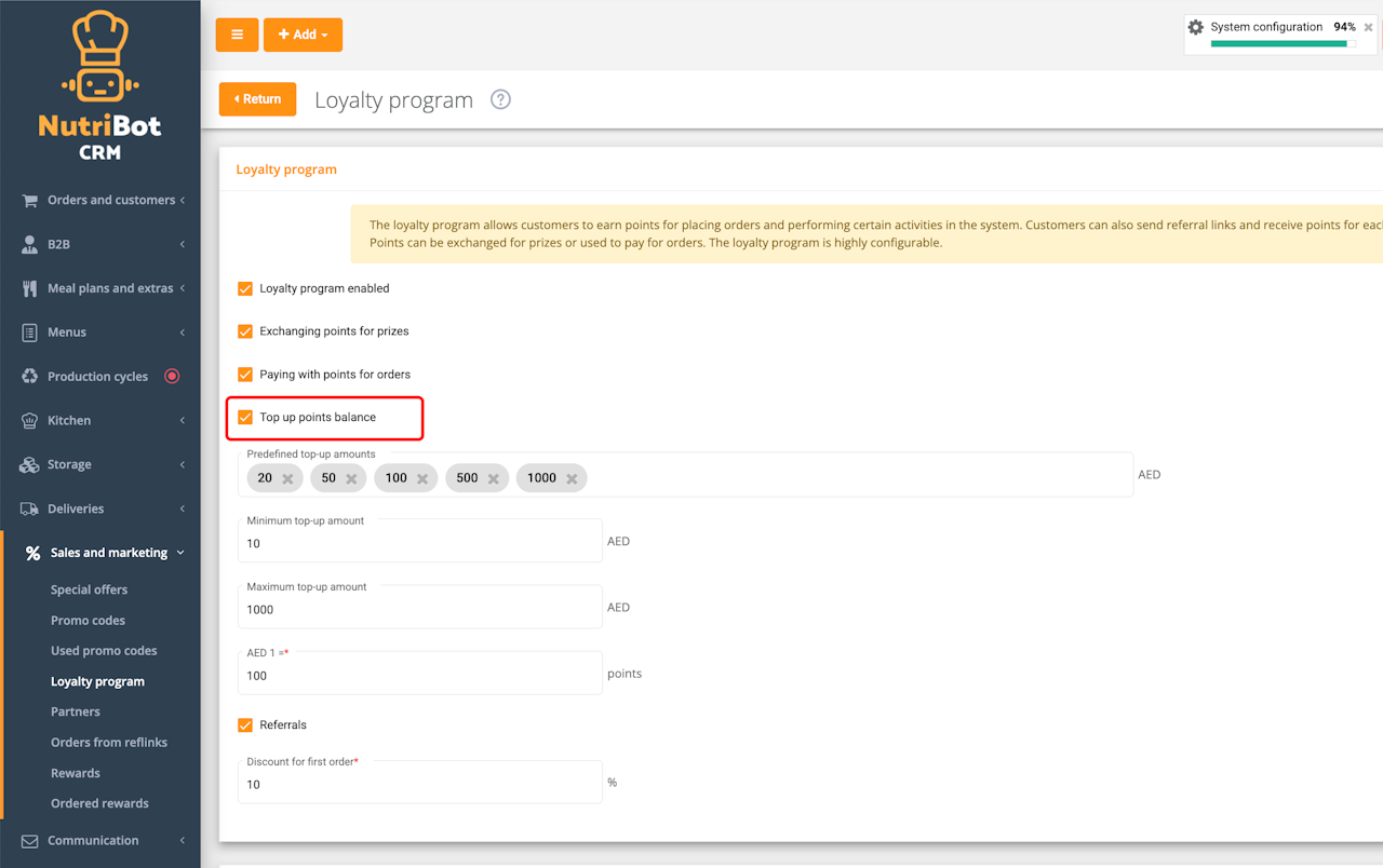 The feature can be enabled in the admin panel by navigating to Sales and marketing → Loyalty program and selecting the “Top up points balance” option.