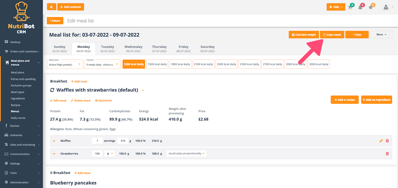 In order to copy ready meals from a given meal plan, click “copy meals” and then go to the selection of meals that you want to copy.