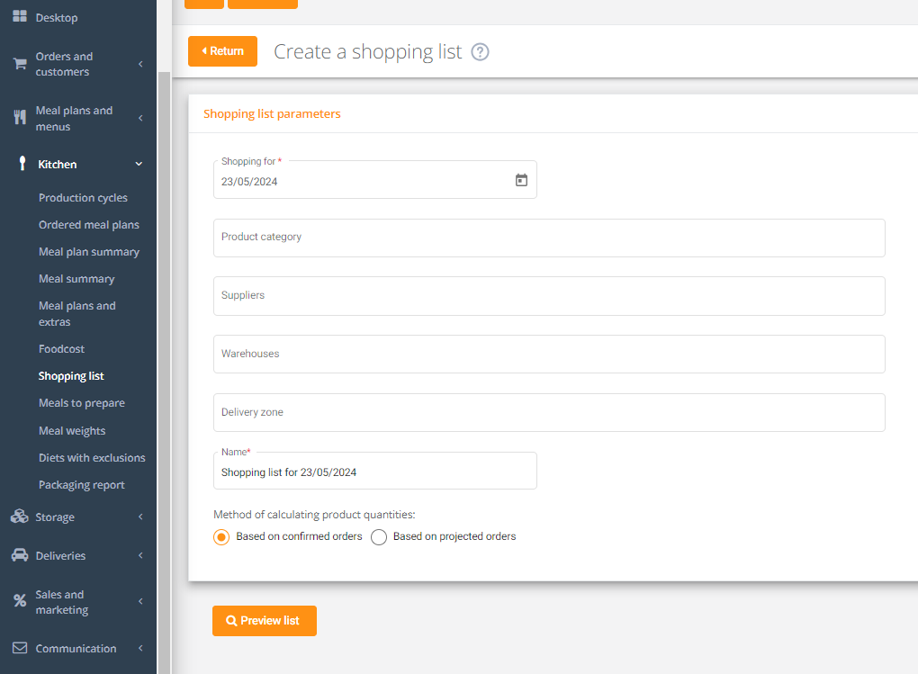 The system offers an option to generate a shopping list based on confirmed orders.