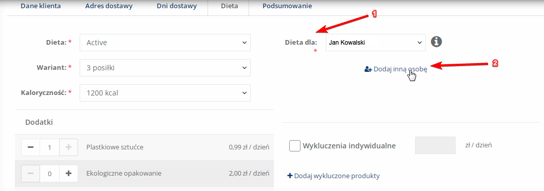 Przy wprowadzaniu zamówienia, mamy możliwość złożenia zamówienia dla kolejnej osoby na jednym koncie klienta (1) np. jeżeli klient zamawia również dietę dla partnera/partnerki.