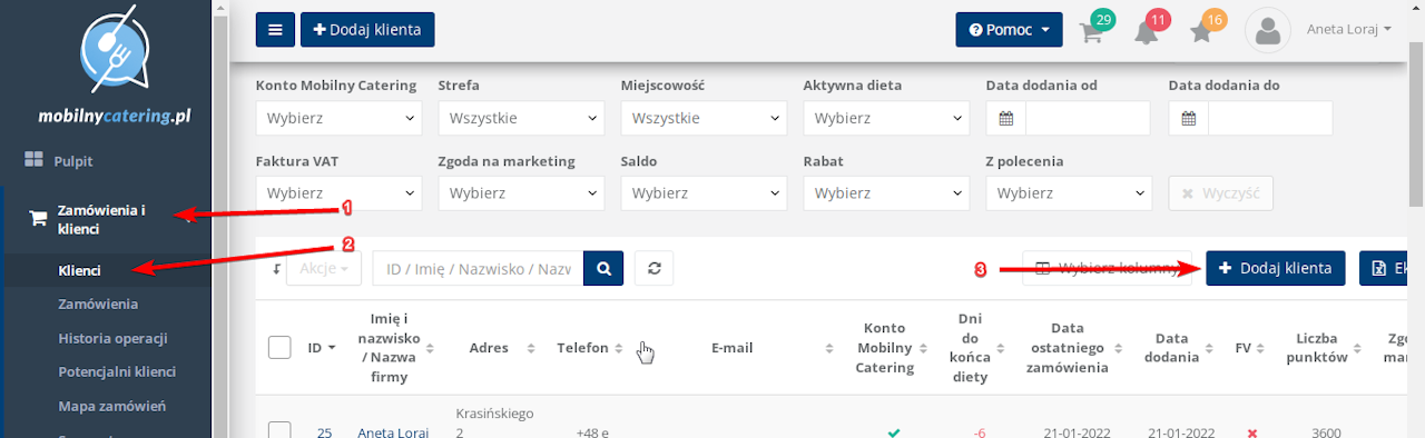 Następnie z lewej strony, w menu wchodzimy w zakładkę Zamówienia i klienci (1) → Klienci (2). Następnie po prawej klikamy +Dodaj klienta (3).
