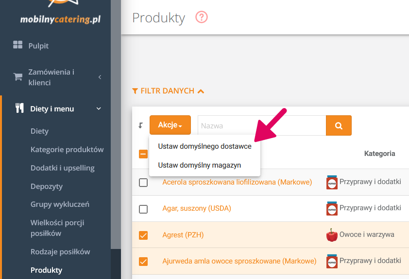 Dostawcy dodani do systemu mogą zostać przypisani do produktów w bazie produktów na poziomie listy poprzez grupowe przypisanie lub poprzez edycję poszczególnych produktów.