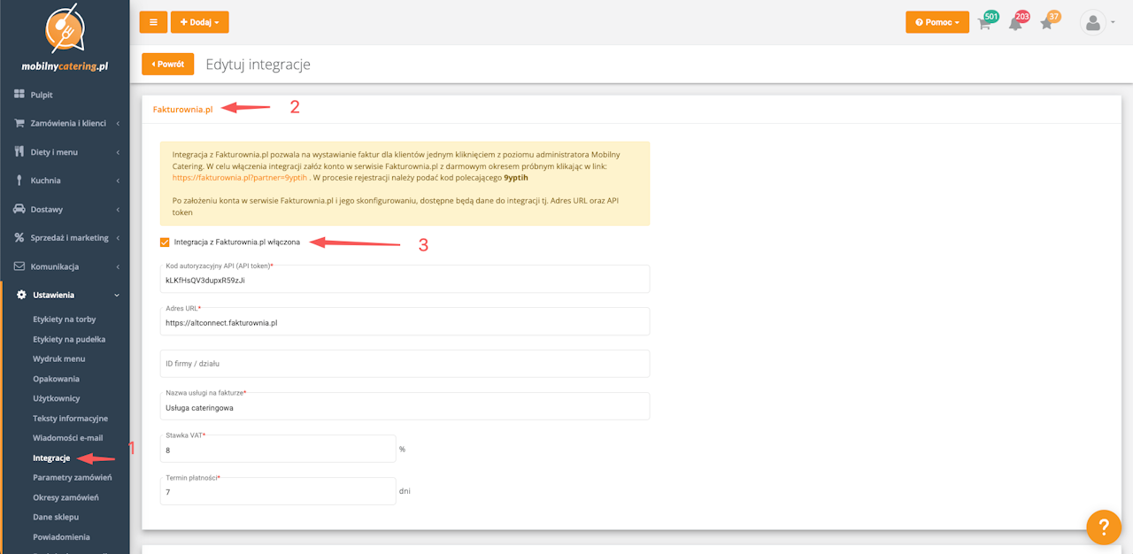 Aby włączyć integrację z Fakturownią przechodzimy do zakładki Ustawienia ➔ Integracje ➔ klikamy edytuj ➔ aktywujemy integrację z Fakturownia.pl
