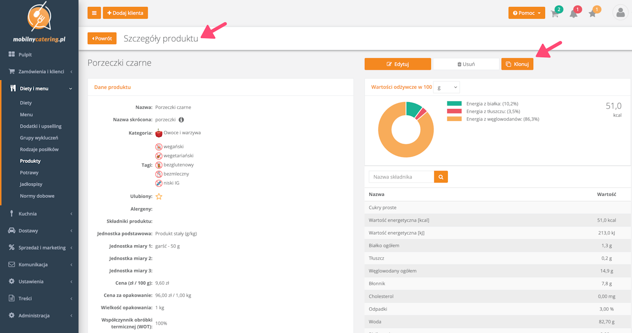 Funkcja klonowania produktu jest przydatna w momencie tworzenia podobnego produktu już wpisanego w systemie (o tych samych lub zbliżonych wartościach odżywczych).