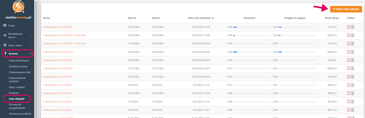 W systemie dostępna jest opcja wygenerowania listy zakupów na podstawie potwierdzonych zamówień.