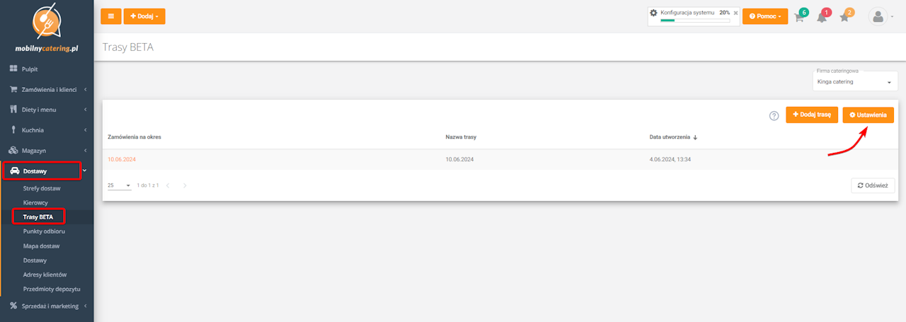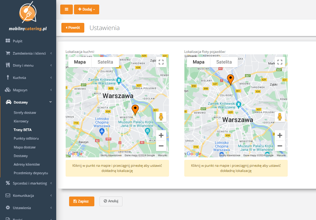 W pierwszej kolejności musimy przejść do zakładki “Dostawy” → “Trasy”, a następnie do ustawień, gdzie dodamy lokalizację naszej kuchni oraz floty pojazdów.