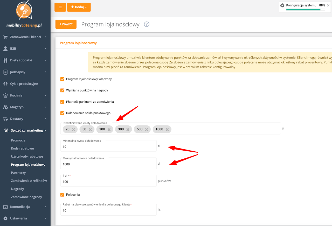 Funkcję można włączyć w panelu admina, przechodząc do Sprzedaż i marketing → Program lojalnościowy i zaznaczając opcję „Doładowanie salda punktowego”.