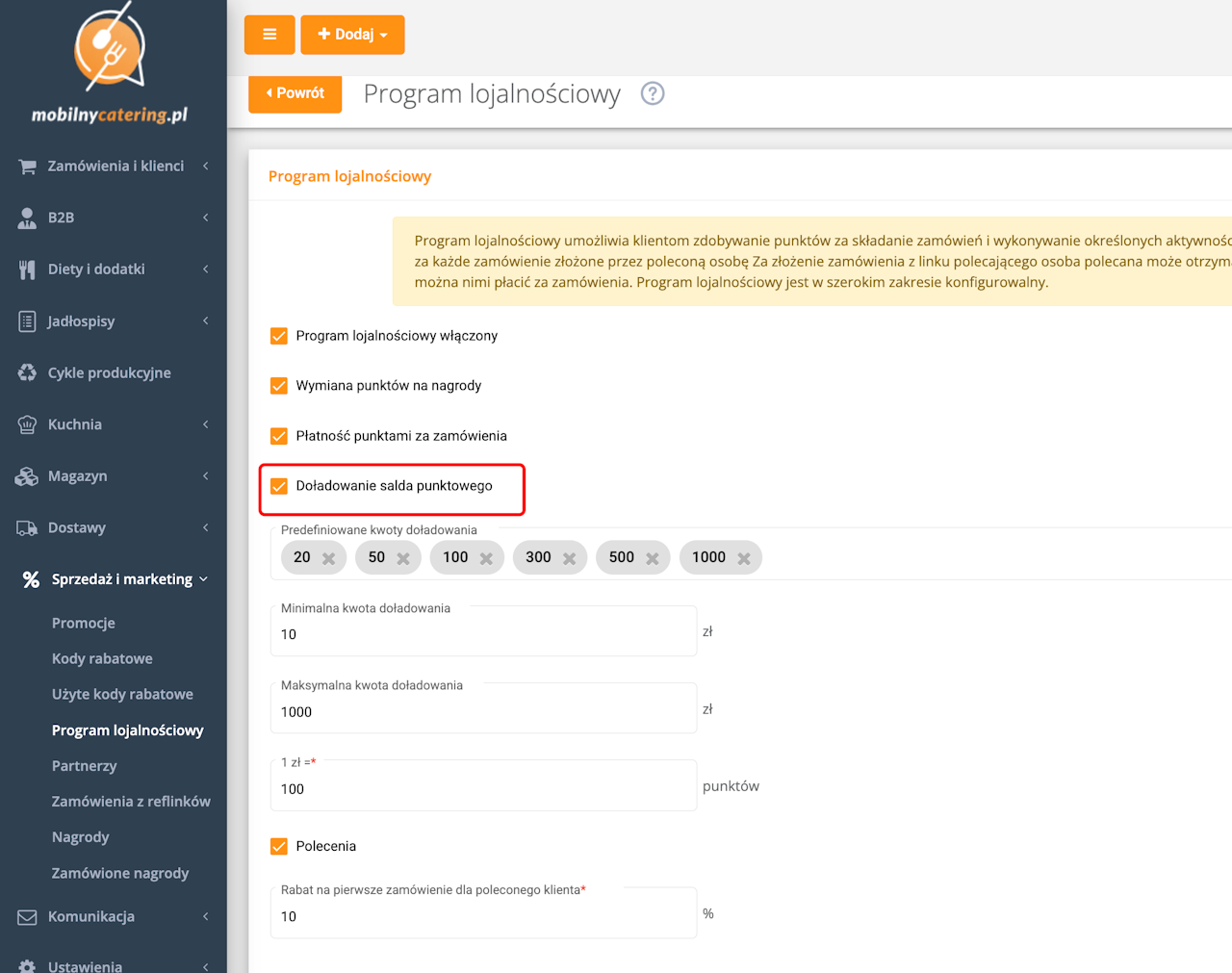 Funkcję można włączyć w panelu admina, przechodząc do Sprzedaż i marketing → Program lojalnościowy i zaznaczając opcję „Doładowanie salda punktowego”.